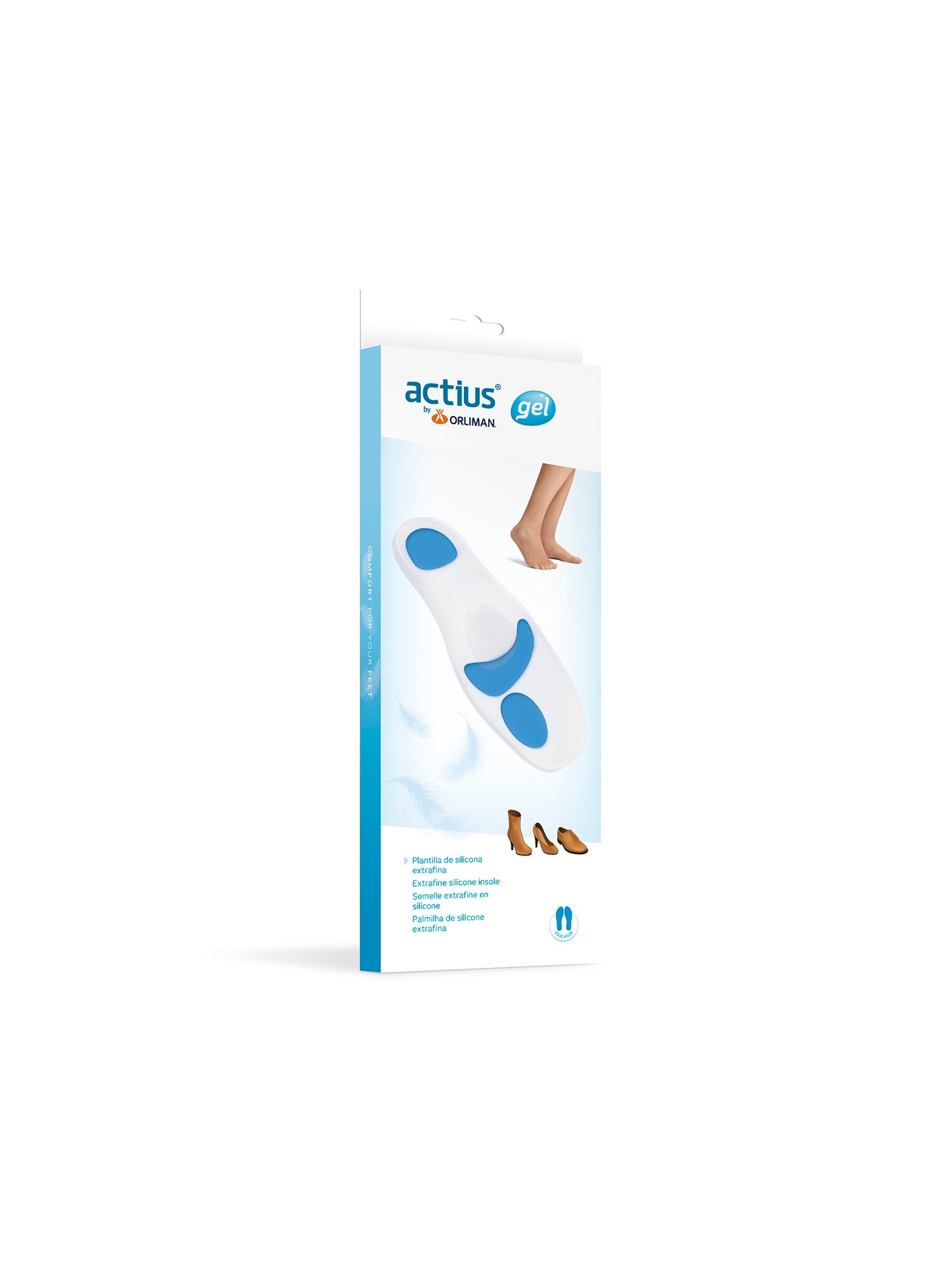 Plantilla de silicona viscoelástica extrafina que está especialmente ideada para proporcionar una correcta amortiguación de los puntos de carga de los pies, que permite una gran adaptación a la mayoría del calzado debido a su menor espesor, con apoyos metatarsal y calcáneo en diferente densidad y con apoyo retrocapital y puente, y que es ideal para la práctica deportiva.