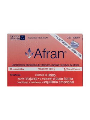La fórmula de Afran 30comp es rica en safranal, magnesio y vitamina B6, los cuales actúan de forma sinérgica asegurando unos niveles óptimos de serotonina, un neurotransmisor fundamental para el buen funcionamiento del sistema nervioso.