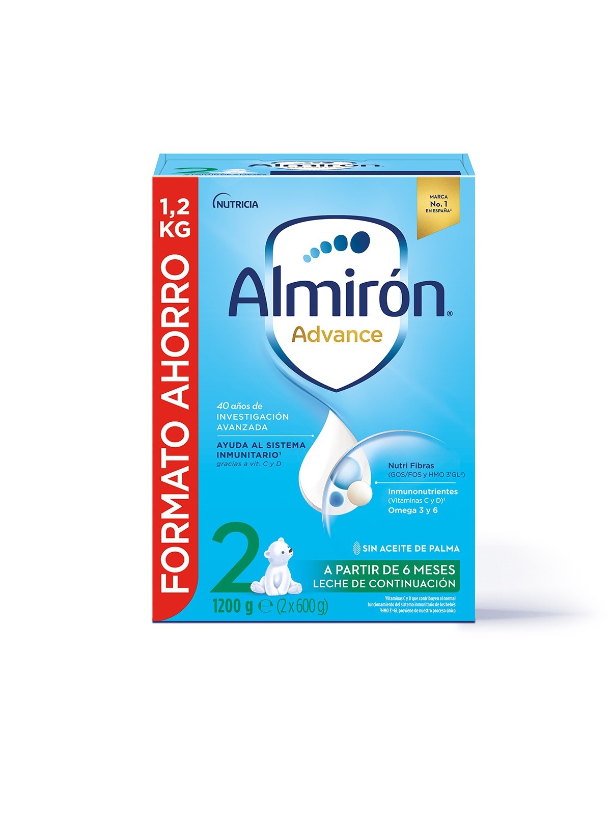 Almirón Advance 2 Leche de Continuación 1200gr leche de continuación que contiene Omega 6, Omega3 y oligosacáridos presentes en la leche humana. Contribuye al desarrollo cerebral y de los tejidos nerviosos. Además, ayuda al normal funcionamiento del sistema inmunitario gracias a su contenido en Vitaminas C y D. Indicada desde los 6 a los 12 meses del bebé. El formato de 1,2kg contiene tres bolsas de 400gr de producto y un cacito.