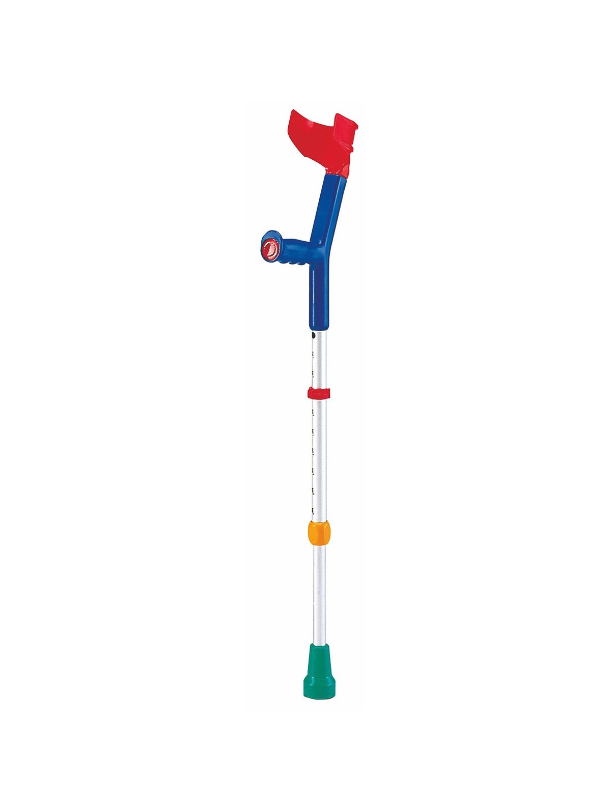Bastón de aluminio infantil ligero y de colores divertidos. Tres ajustes de altura del puño a la codera y nueve regulaciones de altura del puño hasta el suelo. Ajuste especial de marcha silenciosa. Y puño con reflectante de seguridad.