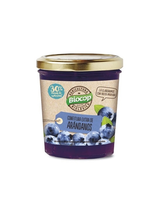 Sabrosa confitura extra o compota de arándanos maduros de Biocop. Contiene un porcentaje muy bajo de azúcar con respecto a otras conservas similares. Viene en sencilla presentación de 320g, en vaso de cristal y tapa metálica fácil de destapar, para conservar su delicioso sabor y aroma. Se ha elaborado mediante procesos artesanales con frutas de cultivos ecológicos y es ideal para galletas, panes, tortas o bien como ingrediente en la preparación de postres. Los arándanos tienen un alto porcentaje de vitaminas, antioxidantes, minerales y fibras que lo convierten en un elemento indispensable en una dieta sana y equilibrada. Ayuda a proteger el cuerpo de las enfermedades y mejorando la salud del sistema nervioso. Esta preparación de Biocop se recomienda para mejorar la concentración y la memoria, ya que puede ayudar a proteger la salud mental.
