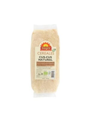 Cereal de cuscús natural, desarrollado por Biográ para otorgar un alimento saludable y orgánico. Emplea la sémola de trigo como materia prima, la cual procede de cultivo ecológico, donde no se usan químicos o insecticidas. Está empaquetado y elaborado en una fábrica que maneja otros productos. Puede llegar a contener derivados lácteos, huevo, soja, gluten, sésamo, apio y frutos secos. Envasado en un empaque de plástico biodegradable transparente. Ayuda a conseguir nutrientes y proteína en un régimen alimenticio. Aporta calorías, hidratos de carbono con lenta digestión, fibra alimenticia y proteína vegetal. Recomendado para preparaciones árabes y dietas veganas o vegetarianas. Almacenar en un sitio fresco y seco, lejos de la humedad y la luz solar. Evitar su consumo si se padece de alergia a la sémola de trigo o alguno de los ingredientes que se manejan en la fábrica.