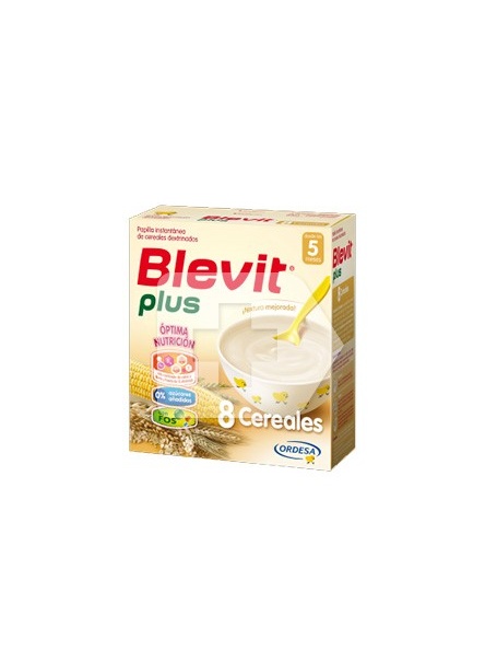 Blevit Plus 8 cereales es una papilla completa elaborada ofreciendo una combinación de 8 cereales: trigo, arroz, avena, cebada, centeno, maíz, mijo y sorgo. La mezla de cereales de este alimento ayudará a tu bebé a cubrir sus necesidades nutricionales, contribuyendo a su desarrollo y crecimiento.