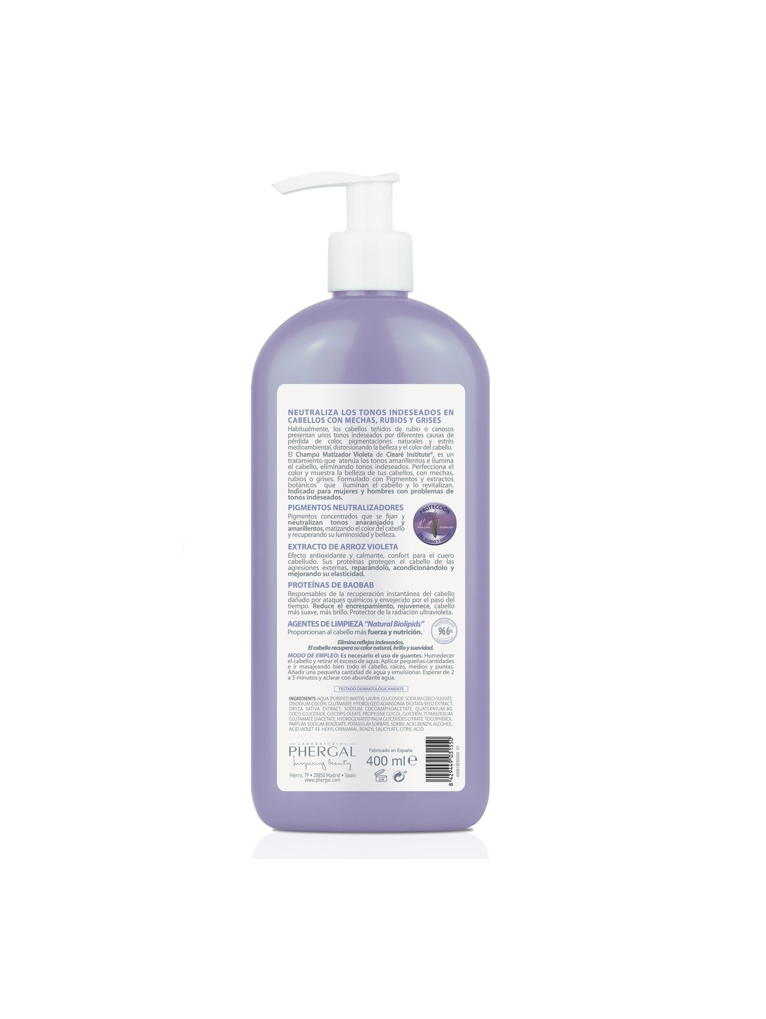Champú Matizador Violeta. Este champú limpia y cuida el cabello de forma suave, reparando y protegiendo el color gracias a la mezcla de sus ingredientes cuidadosamente seleccionados con efecto matizante que ayudan a neutralizar los tonos anaranjados y amarillentos para perfeccionar el color del cabello, dando más vida a los tonos rubios, decolorados o grises, a la vez le aportan suavidad y brillo, reducen el encrespamiento y aportan un efecto calmante para que se pueda utilizar incluso en cueros cabelludos delicados. Es un tratamiento completo con un 96,6% de ingredientes naturales que está indicado tanto para hombres como para mujeres.