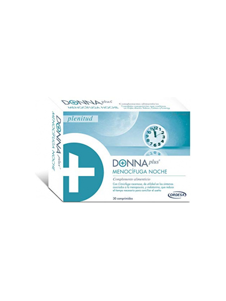 Donna Plus Menocifuga Noche 30 Comp es un complemento alimenticio que tiene en su composición la Cimicifuga racemosa, planta de uso tradicional en caso de sofocos e irritabilidad asociados a la menopausia. Con Melatonina, que contribuye a disminuir el tiempo necesario para conciliar el sueño y GABA y otros compuestos, de utilidad en el mantenimiento de la mineralización ósea y la reducción del cansancio y la fatiga.