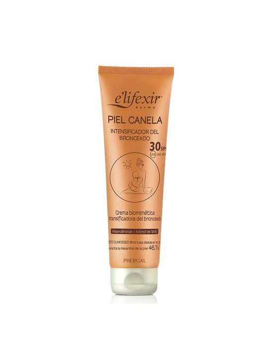 Elifexir Piel Canela Intensificador Bronceado SPF30 150ml es una crema corporal biomimética que contribuye a intensificar el bronceado, gracias a su compuesto activador Melanobronze. Además, ofrece una amplia protección frente a los rayos UVA, UVB e IR-A gracias a sus filtros SPF30.