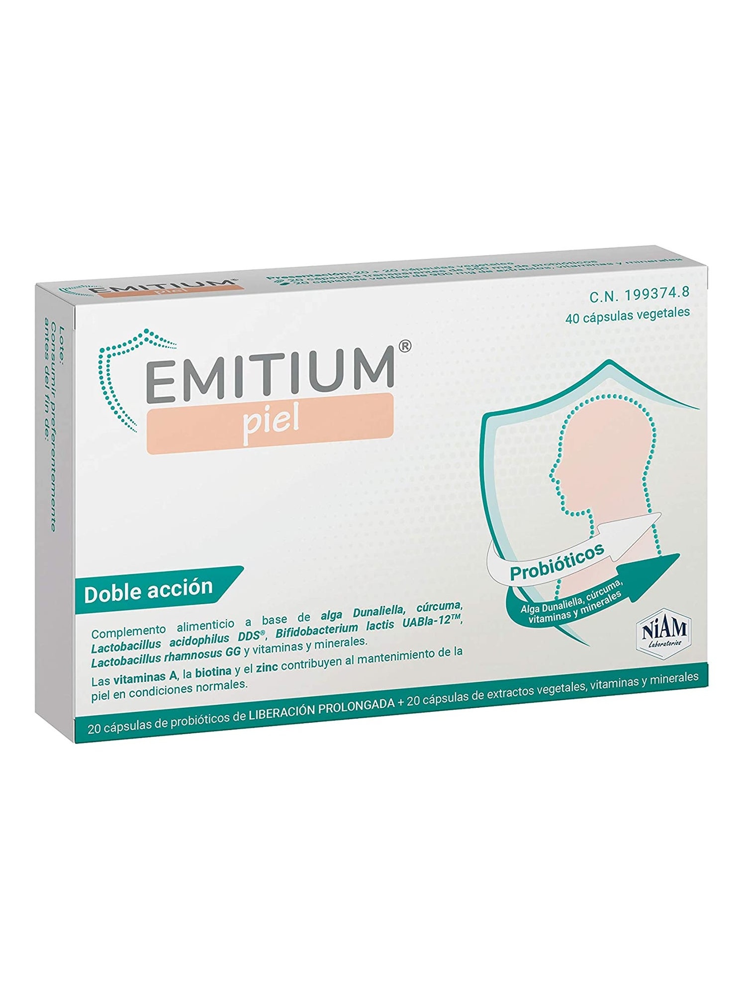 Emitium Piel Doble Acción 40caps es un complemento alimenticio que contribuye al funcionamiento normal del sistema inmunitario, aunque su principal función es la de contribuir al mantenimiento de la piel.