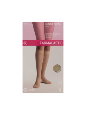 Farmalastic media corta (A-D) compresión normal es una media de compresión para tener especial cuidado de las extremidades. Ayuda a estimular la circulación sanguínea con una compresión adecuada.