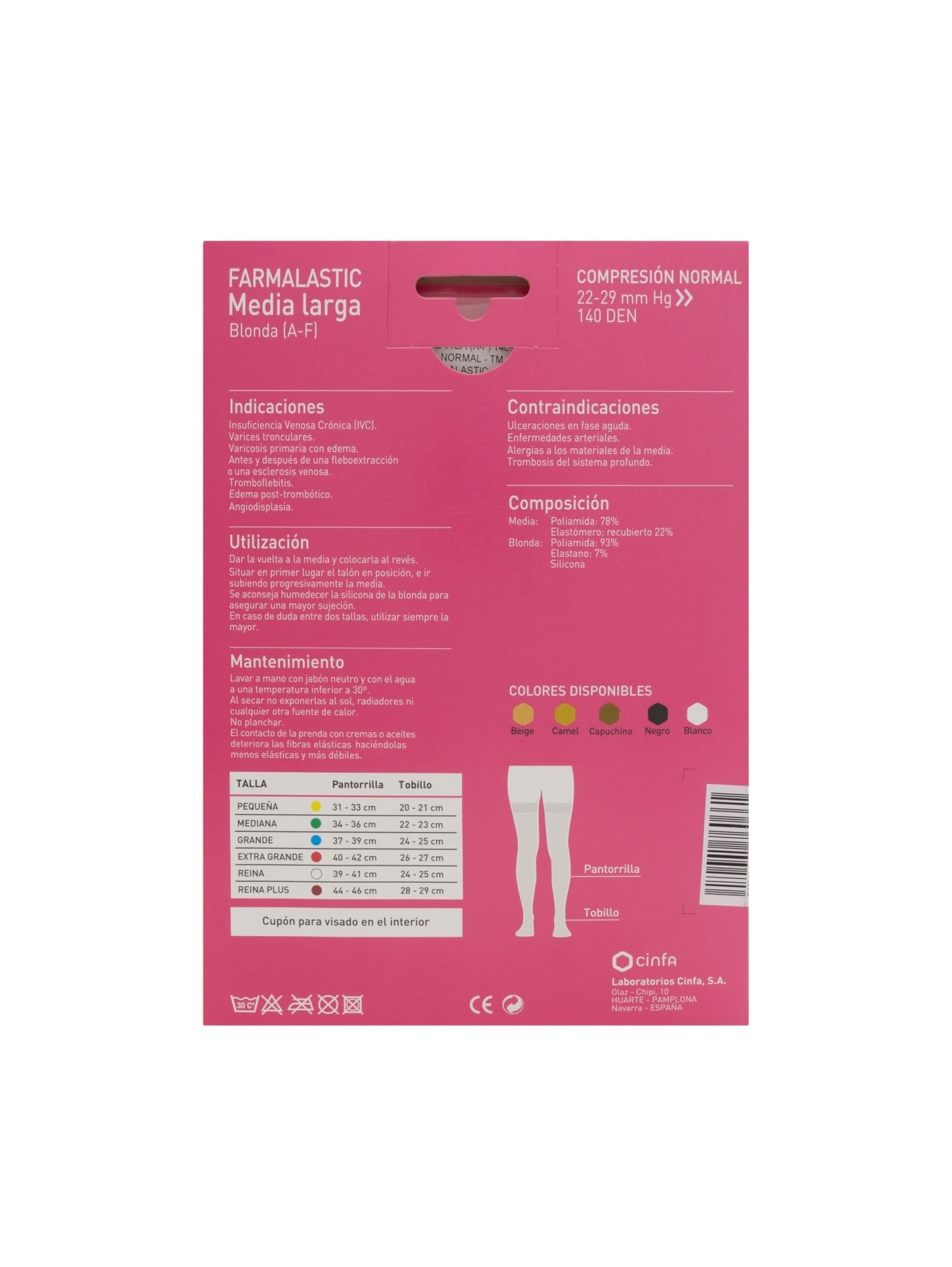Farmalastic media larga blonda (A-F) compresión normal está indicado especialmente para personas en tratamiento de patologías venosas y embarazadas con tendencia al edema. No deja marca de la goma en la pantorrilla y la puntera no comprime los dedos. Se sujeta con una blonda de silicona que son mucho más elegantes que las medias cortas.