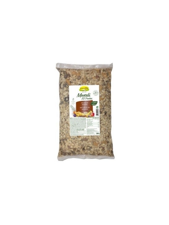 Receta de muesli de cereales con diez tipos diferentes de deliciosas frutas desecadas, frutos secos, semillas de girasol, lino y sésamo. Sin azúcar. Aporta fibra y energía constante durante horas gracias a los hidratos de carbono de absorción lenta. Sin colorantes, conservantes, ni aditivos químicos.