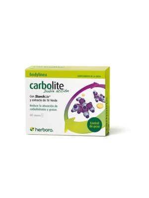 Herbora Bodylinea Carbolite Doble Acción 60 Cápsulas complemento alimenticio en forma de cápsulas a base de StrachLite y Extracto de Té Verde. Colabora a reducir la ingesta de los hidratos de carbono y de las grasas.