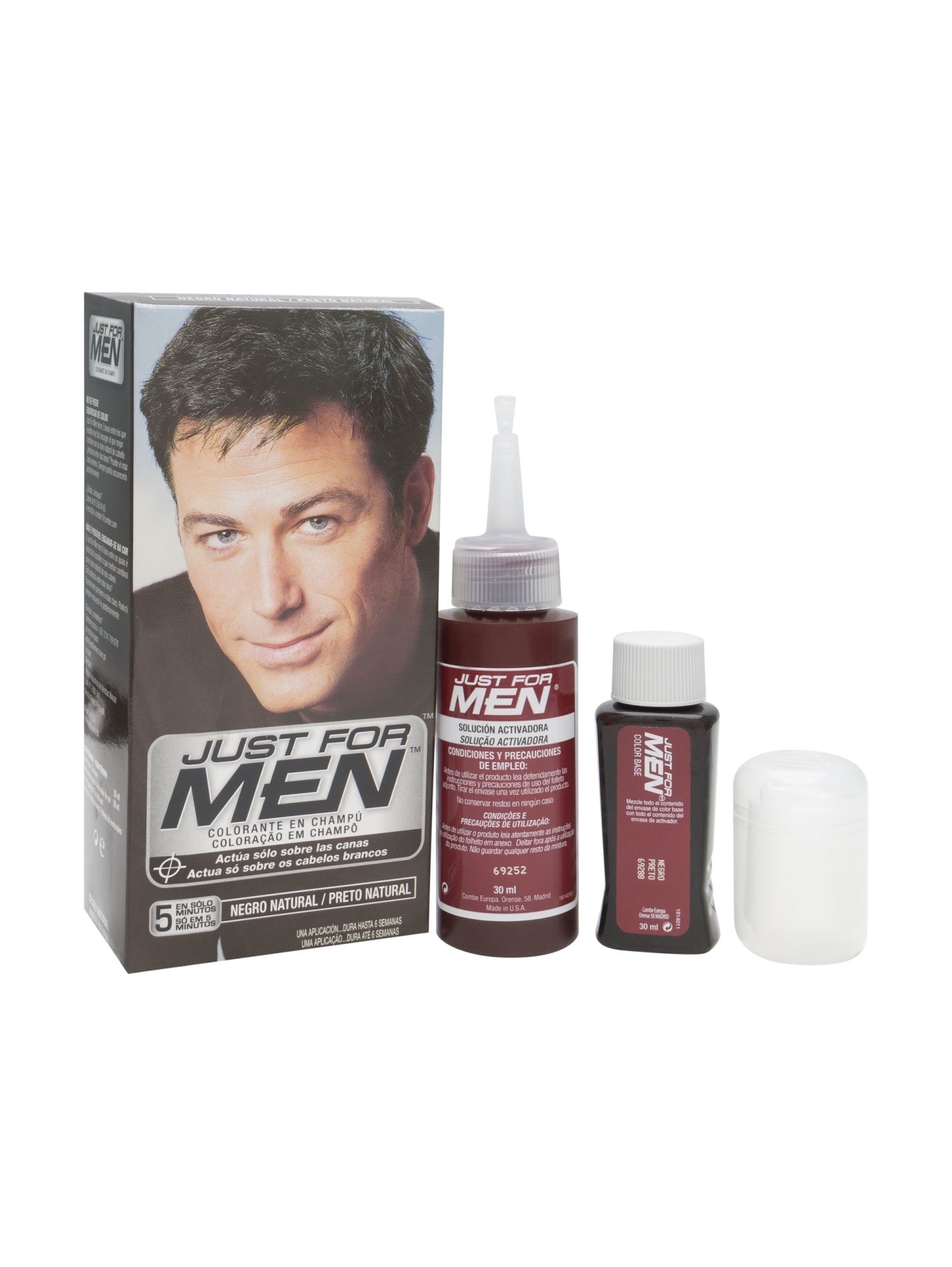 Just For Men champú colorante negro incide sobre las canas y las elimina al 100% sin alterar el color natural del pelo. Es el tinte número 1 en el mundo en coloración masculina.