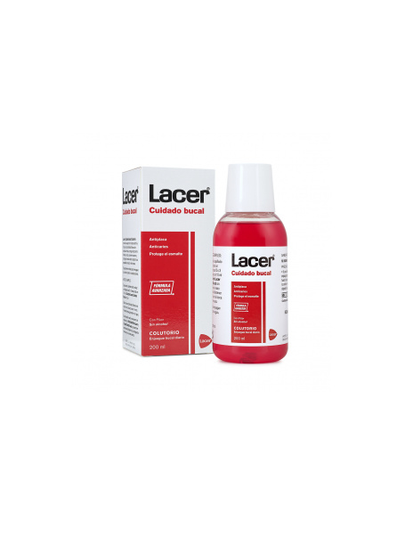 Lacer colutorio es un antiséptico en enjuague bucal que previene las infecciones bucales. Su composición con fluoruro sódico y de cinc, así como triclosán y xilitol, protegerán y limpiarán tus dientes, ayudándote a evitar la formación de caries, placa dental e inflamaciones bucales.