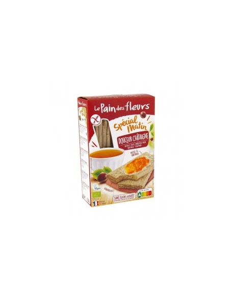 Tostadas de pan de castañas procedentes de agricultura ecológica pensados para ayudar a tener un desayuno sano, con un sabor original que aporta energía cada mañana, sus ingredientes son una fuente de fibra natural sin azúcares añadidos para poder consumir por toda la familia.