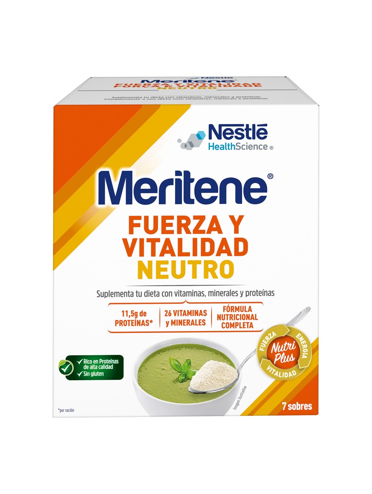 Meritene polvo neutro 50g. Meritene Fuerza Y Vitalidad Neutro es una solución nutricional simple que puede agregarse a sus platos favoritos sin apenas cambios en el sabor o la textura, y está diseñada para personas que necesitan complementar su dieta sin aumentarsu ingesta de alimentos. Proporciona 26 vitaminas, minerales y proteínas de alta calidad para ayudar a mantener la masa muscular, reducir la fatiga y respaldar el funcionamiento normal del sistema inmunológico.