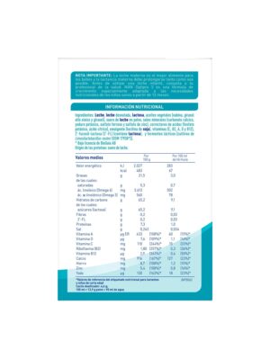 Leche entera, leche desnatada, lactosa, aceites vegetales (nabina, girasol alto oleico y girasol), suero de leche en polvo, sales minerales (carbonato cálcico, yoduro potásico, sulfato ferroso y sulfato de zinc), corrector de acidez (fosfato potásico, ácido cítrico), emulgente (lecitina de soja), vitaminas (C, B2, A, D y B12), 2′-fucosil-lactosa (2’-FL) (contiene leche) y fermentos lácticos [cultivos de Lactobacillus reuteri (DSM 17938*)]. * Bajo licencia de BioGaia AB.