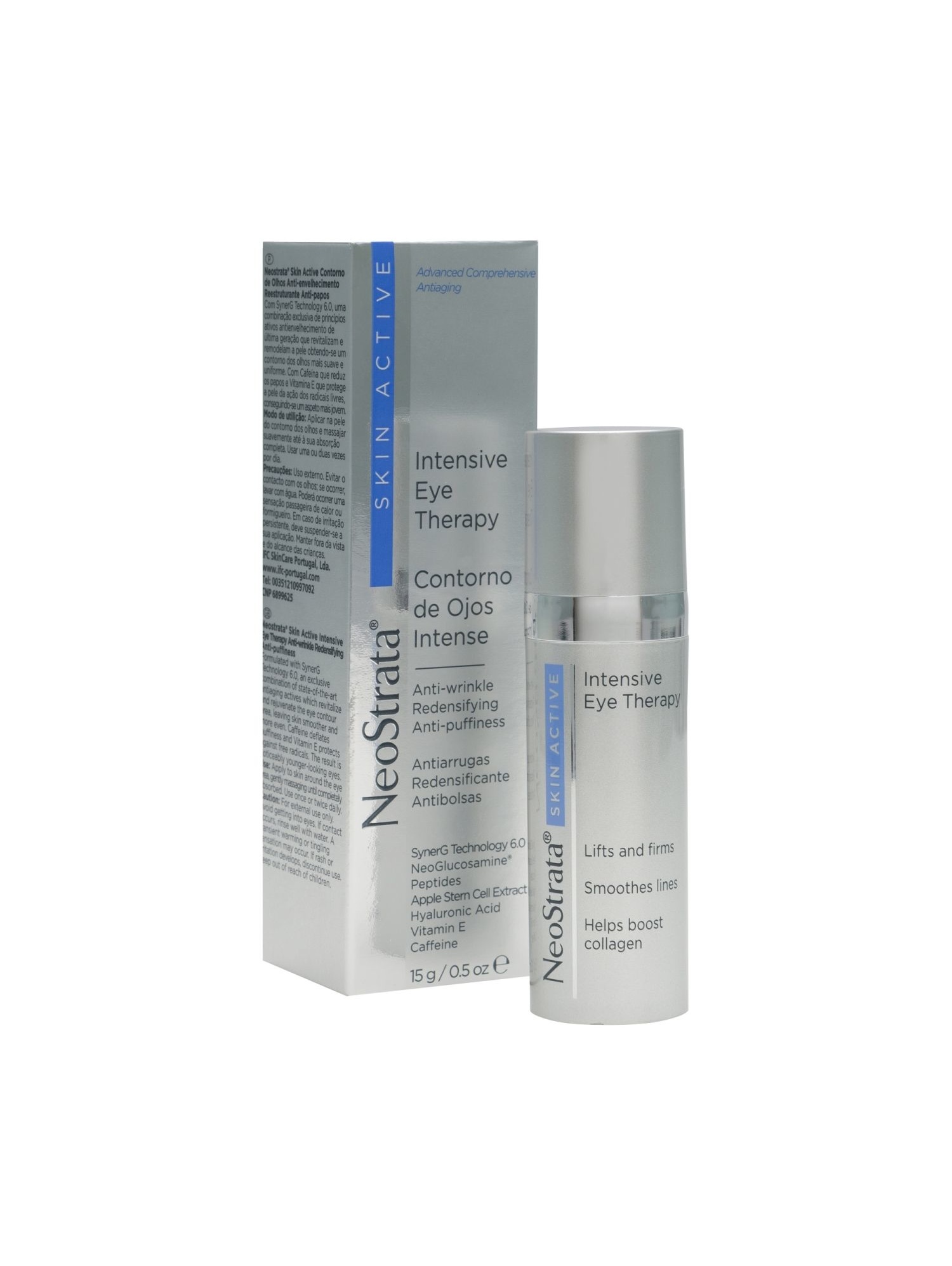 NeoStrata® Skin Active contorno de ojos 15g ha sido formulada con SynerG Technology 6.0, que combina NeoGlucosamina®, un exfoliante no ácido con propiedades hidratantes y aclarantes, con la acción de los péptidos y extracto de células madre de manzana, para potenciar la acción redensificante de esta zona. Contribuye a que las pequeñas arrugas o marcas de expresión se rellenen. Este crema correctora par el contorno de ojos contiene cafeína para reducir las bolsas de los ojos causadas por la retención de líquidos y Vitamina E, con propiedades antioxidantes.