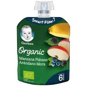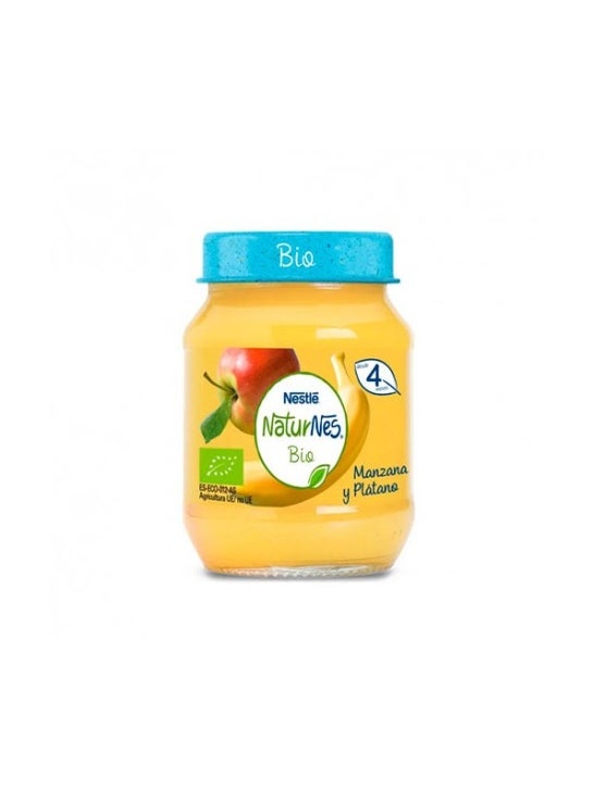 Potito de bebé elaborado con Manzana y plátano, base de ingredientes de origen ecológico especialmente para la alimentación de los bebés a partir de 4 meses de edad. La composición contiene únicamente frutas y sin añadir azúcar o espesantes. Producto sin gluten, colorantes, ni conservantes, según la legislación vigente.