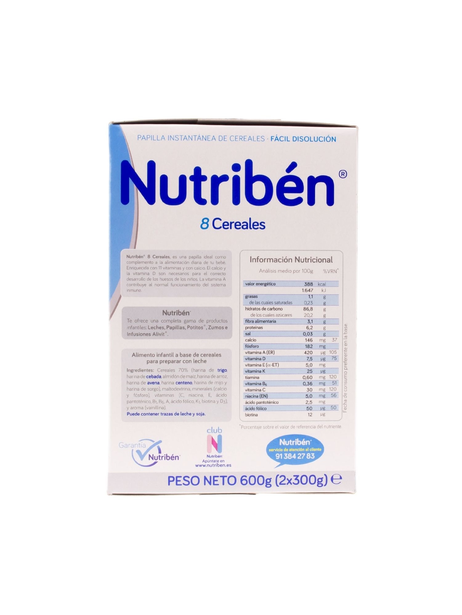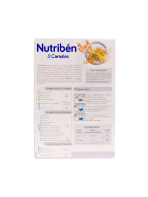 Con el fin de favorecer la digestión del bebé, la papilla Nutribén 8 cereales está elaborada con un total de 8 cereales diversos, que equilibran la alimentación del niño gracias a la nutritiva mezcla de trigo, cebada, centeno, maíz, arroz, avena, mijo y sorgo. Su composición con fibra favorece a su flora intestinal, mejorando su digestión y aportándole muchas energías.