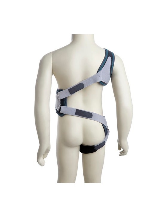 Ortesis transpirable con una anilla en el hombro, una almohada torácica y otra en la zona de la convexidad. Las tres piezas se unen por cinchas laterales y terminan el correaje con pequeñas bandas que rodean una de las piernas del bebé. Las correas regulan la tensión y se ajustan a cada fisionomía. No apto para uso sin la supervisión de un médico pediatra.