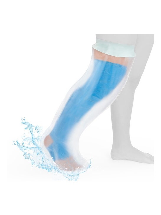 Funda de protección hermética para piernas de niños. Su diseño elaborado con material impermeable y flexible ayuda a proteger escayolas y vendajes de pierna facilitando el baño o la ducha.