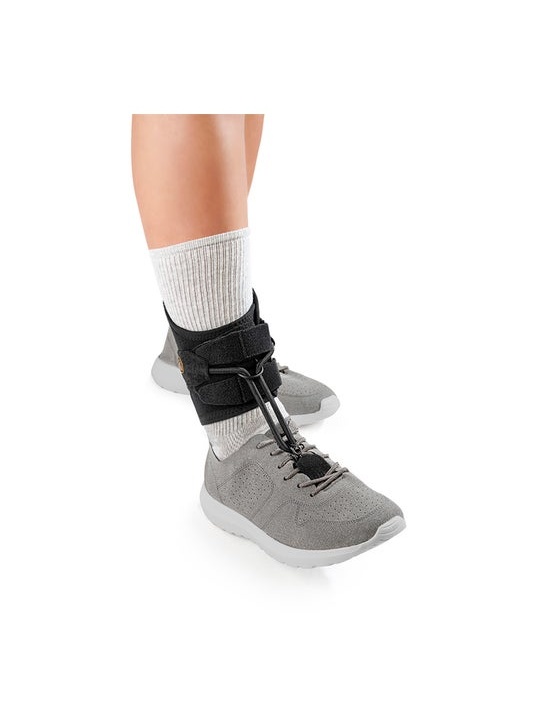 Elástico de Orliman para ubicar en órtesis antiequinas. Pieza complementaria que se anuda en un aro de la tobillera, bajando hasta los cordones del zapato. Tiene como objetivo limitar la flexión del pie al caminar, manteniéndolo en un ángulo de 10°. Mejora la condición de la pisada y permite una correcta coordinación entre el talón y los dedos. Estabiliza la pisada, y consiste en un apoyo mecánico para elevar el pie de forma recta sin encorvar el arco.