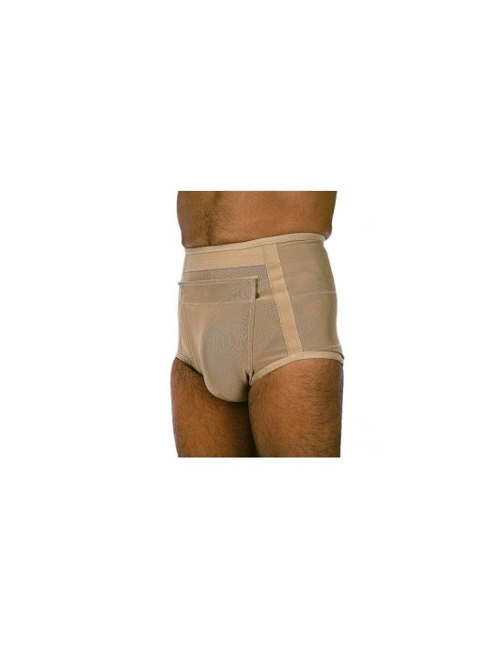 Slip confeccionado con tejido de diferente elasticidad en distintos puntos, dos tipos de almohadillas planas, banda escrotal sujeta al abdomen con cierre velcro, fácil colocación y lavado, ofrece contención uniforme de la zona inguinal. Indicada para hernias inguinales, especialmente en procesos pre y post-quirúrgicos.