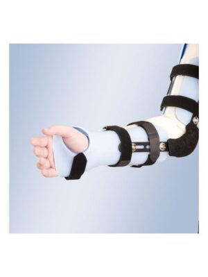 Esta ortesis activa de codo, ayudando a la flexión y extensión del mismo. Está diseñada por Orliman para adaptarse al brazo y al antebrazo, cuenta con articulación regulable y ha sido confeccionada en un material termoplástico. Además del sistema de articulación de codo, tiene una guía para ajustarla dimensionalmente, con algunas cinchas que contribuyen a la regulación. También su sistema de cierre con micro gancho, se puede recortar dependiendo de la longitud deseada. Por otro lado, está unida a una serie de lengüetas hechas de polietileno con un espesor de 1 mm, que logra complementarse junto a una cincha de desgravación. Esto sirve para inmovilizar la articulación del codo. A su vez, ayuda a aumentar la estabilidad fracturaría para obtener una compacidad simétrica en las partes blandas ubicadas en el foco de la fractura.