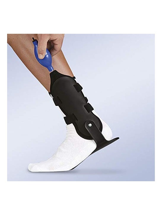Ortesis estabilizadora para el control del tobillo derecho. Compuesta por dos piezas termoplásticas articuladas con un soporte sobre la planta del pie y laterales inflables para mejorar la individualización y aumentar la estabilización. Incluye 2 almohadillas en la zona posterior de cada cincha para evitar rozaduras. Ayuda a estabilizar y dar soporte al tobillo. Indicado para inmovilizaciones post lesión, recuperación funcional, inestabilidades de tobillo, prevención de lesiones deportivas o fascitis plantar.