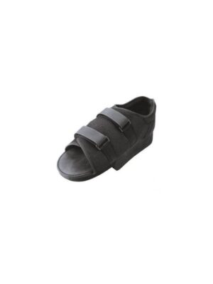 Horma neutra,sirve para pie izquierdo y derecho, suela antideslizante y sistema de cierre velcro que permite la adaptación en piescon grandes deformidades o con vendajes post-operatorios. Confeccionado en material transpirable y sin puntera, idóneo para la cirugía de dedos y antepié, con refuerzo rígido en el talón, ideal para problemas en la zona del calcáneo. indicado cuando el vendaje produce una inmovilización tibio-tarsiana permitiendo la carga y la marcha desde la fase de apoyo hasta la fase de despegue. Ligera alineación en talo.