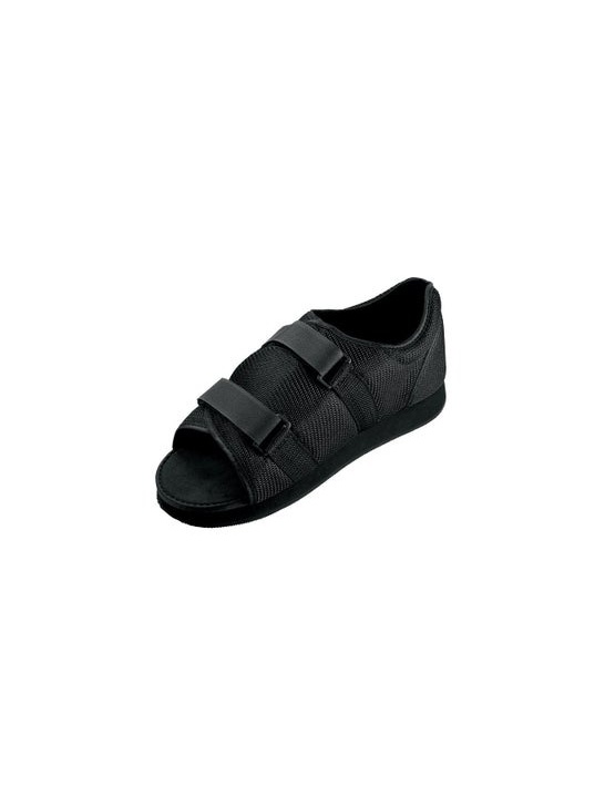 Zapato ortopedico postquirúrgico. Fabricado en poliéster, con una horma neutra que permite al pie izquierdo como al derecho, suela antideslizante y sistema de 2 cierres de velcro que permite la adaptación en pies con grandes deformidades o con vendajes post operatorios. Diseñados en material transpirable con puntera abierta, apto para la post cirugía de dedos y antepié. Contiene en el talón un refuerzo rígido. Apto para problemas en la zona del calcáneo. En color negro, poliéster 100%. Talla 2 para pie 39-40.