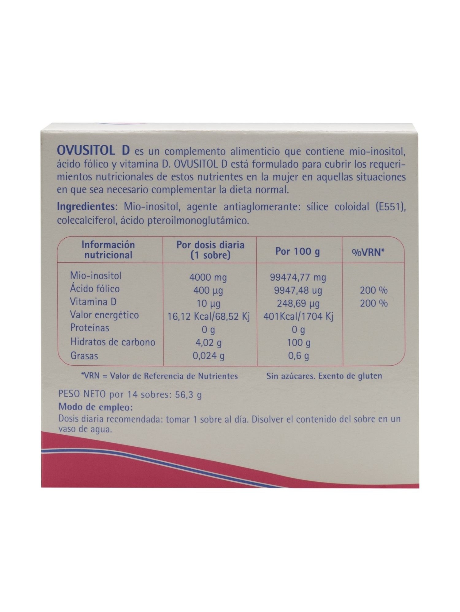 Este suplemento contiene: Mio-inositol, que ayuda a la estructura celular; ácido fólico, que contribuye al proceso de división celular y al metabolismo de la homocisteina, y Vitamina D, que favorece la absorción normal del calcio y al proceso de división celular.