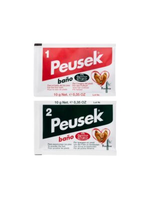 - Espolvorear el contenido del sobre 1 de Peusek baño antitranspirante en agua e introducir los pies.
