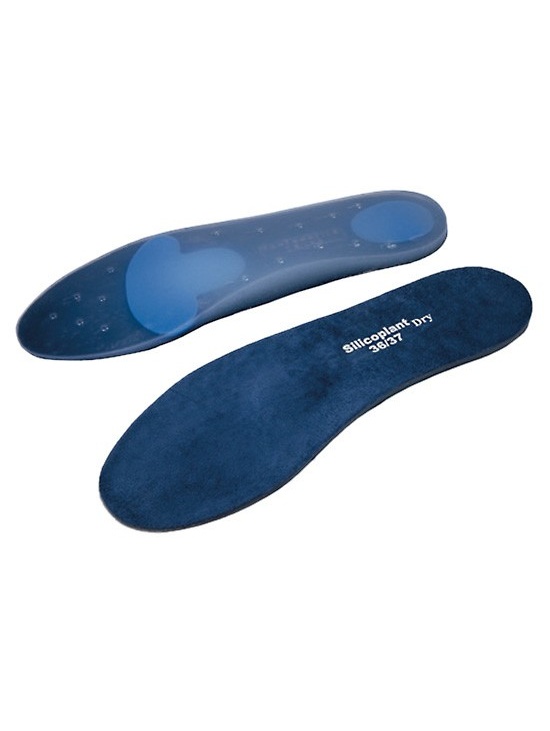 Plantillas de silicona viscoelástica, se adaptan la temperatura corporal, lavables, plantilla con arco longitudinal interno y descarga metatarsal, con almohadillas de silicona blanda de descarga en las cabezas metatarsales y talón, forrada de tejido 100% transpirable, absorbente, antiolor y antiácaros. Indicada para dolor plantar, dolor zona metatarsal del pie, sobrecarga en talón, sobrecarga plantar, práctica deportiva, personas que permanecen mucho tiempo de pie.