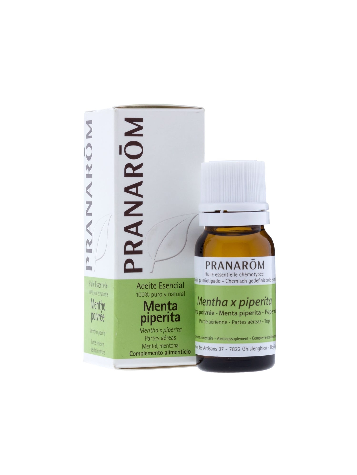 El aceite esencial de menta (Mentha piperita) es tonificante. Su efecto antiespasmódico calma las indigestiones y las nauseas, así como los mareos causados por los viajes. Gracias a su efecto analgésico, este aceite es un soporte en el caso de dolor por traumatismo, tendinitis, ciática, reumatismo, cefalea o neuralgia. Asimismo, tiene un efecto refrescante. También tiene propiedades antisépticas.