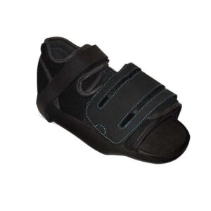 Zapato ortopédico diseñado para el uso post cirugías quirúrgicas en el pie. Diseñados con un sistema de cierre con velcros, que permiten adaptarse anatómicamente a pies con vendajes, escayolas postoperatorias, inflamación o deformaciones en los dedos. Elaborados en un tejido transpirable y fácil de higienizar. Contribuyen a un buen apoyo al andar, son cómodos y seguros. Talla 41 a 42, color negro. Adecuado para hombres y mujeres.