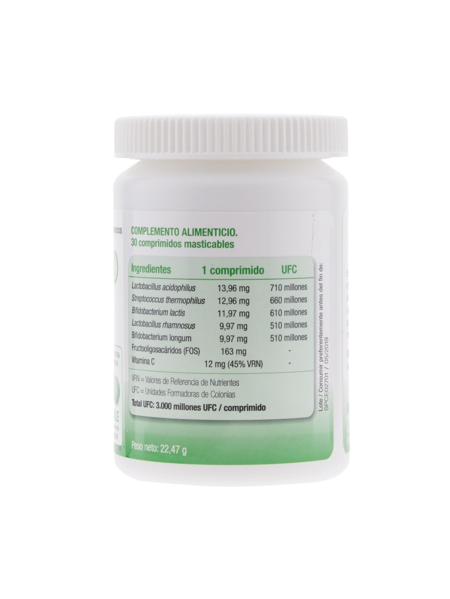 LACTOBACILLUS ACIDOPHILUS, STREPTOCOCCUS THERMOPHILUS, BIFIDOBACTERIUM LACTIS, LACTOBACILLUS RHAMNOSUS, BIFIDOBACTERIUM LONGUM, FRUCTOOLIGOSACÁRIDOS (FOS), VITAMINA C