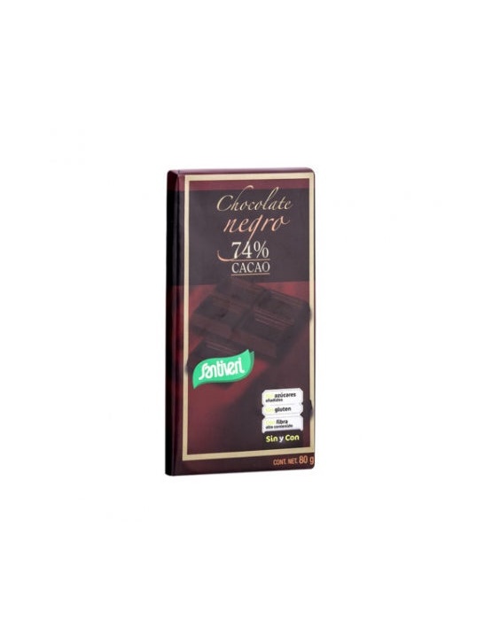 Santiveri Chocolate Negro 74% Cacao Sin Azúcar 80g es un chocolate de alta calidad con 74% de cacao puro endulzado con maltitol. Es un interesante estimulador del sistema nervioso y del buen funcionamiento del sistema digestivo. Posee una gran acción antioxidante que ayuda al cuidado del corazón y para ralentizar el envejecimiento celular. Apropiado para las personas que quieren disfrutar de las propiedades de un gran chocolate sin dejar de cuidar la salud.