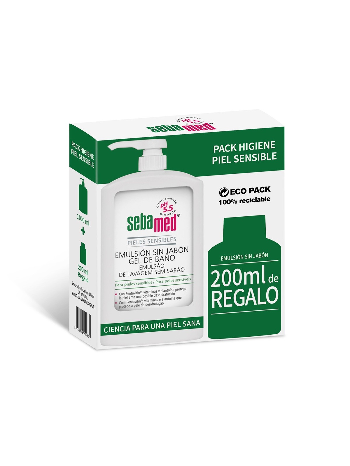 Sebamed Emulsión S/Jabón 1L + Regalo 200 ml es un gel de baño corporal que ayuda a garantizar la conservación del equilibrio hídrico de la piel. Refuerza y protege la función de barrera natural del manto ácido de la piel. Con el pH de 5,5 de la piel sana. Sin jabón ni agentes alcalinos. Limpieza suave y profunda de los poros. Los hidratantes naturales alantoína y pentavitina dejan la piel suave y tersa. El pantenol regenera la piel. Sensación única después del lavado: la piel está limpia, suave y elástica. De regalo, el formato de 200 ml.