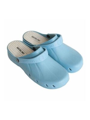 Zueco de color azul para trabajar que ayuda a dar confort a los pies cansados. Ideales para usar cualquier hora del día, incluso si pasas mucho tiempo de pie. Aportan varias propiedades, anti-humedad y los mantiene en seco, previene malos olores, evita la electricidad estática por su material de caucho técnico y se extrae la plantilla para facilitar el lavado. Formato talla número 34.