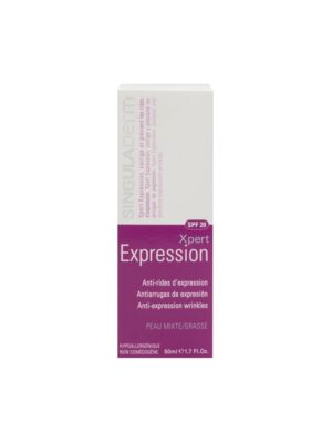 Singuladerm Xpert Expression es un tratamiento intensivo recomendado para aquellas pieles mixtas o grasas que sufren sus primeras líneas de expresión y quieren ralentizar el envejecimiento cutáneo. Constituye una gama cosmética muy adecuada para reducir las arrugas que se sitúan alrededor de los labios, de los ojos o sobre la frente. Esta crema de textura ligera incorpora un factor de protección solar 20, ayudando así a reducir el envejecimiento cutáneo provocado por la alta exposición a los rayos ultravioleta.