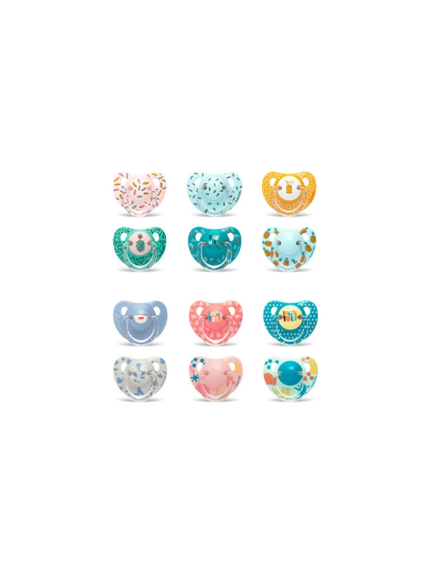 2 chupetes de tetina anatómica de silicona para bebés a partir de 18 meses, con diseño atractivo. Contiene una tetina fisiológica realizada en silicona médica, este material evita que se absorban olores y sabores. Gracias a su forma ergonómica, plana y simétrica, se adapta a la perfección a la boquita del bebé y a su vez ejerce una mínima presión sobre el paladar. *El color y diseño del producto pueden variar según la disponibilidad.