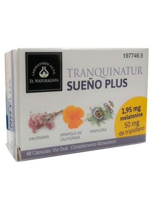 Tranquinatur sueño plus 48 cápsulas, Es un complemento alimenticio que combina las propiedades de las plantas con efectos calmantes e hipnóticos (valeriana, pasiflora y amapola de California), y los efectos de la melatonina y el triptófano están directamente relacionados con la dificultad para conciliar el sueño.