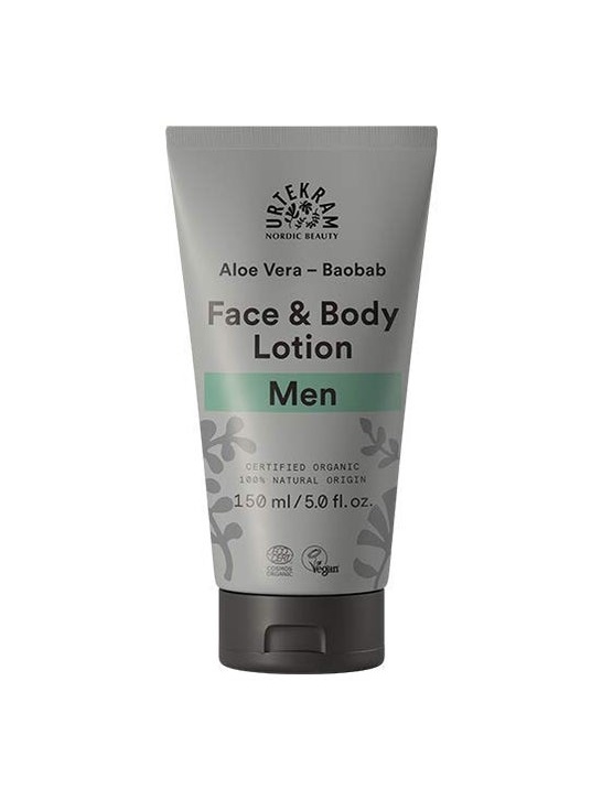 Loción para cara y cuerpo especial para hombre de la marca Urtekram. Esta loción contiene un alto poder antioxidante y está certificada como procedencia orgánica 100% natural y vegana, no testada en animales.