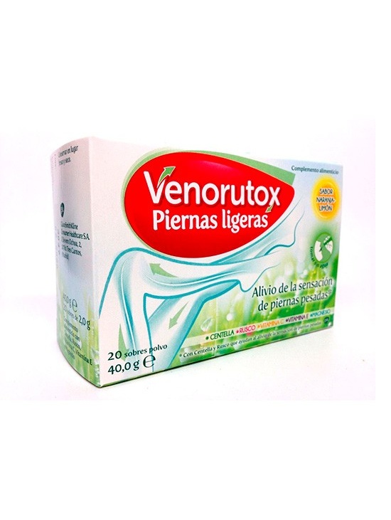 No contiene colorantes, conservantes ni edulcorantes. Cada caja de Venorutox Piernas Ligeras contiene 20 sobres de polvo bucodispersable de sabor naranja-limón.