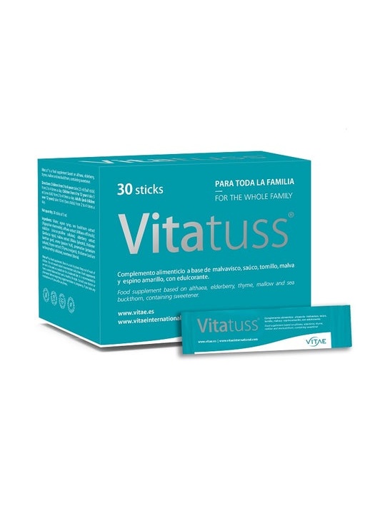 Vitae Vitatuss 30 sticks es un suplemento elaborado a base de extracto de malvavisco, saúco, tomillo, malva y espino blanco. Con un sabor afrutado, este complemento suaviza y favorece la hidratación de la mucosa, al mismo tiempo que reduce los síntomas del resfriado. Su formato en sticks favorece su transporte y administración.